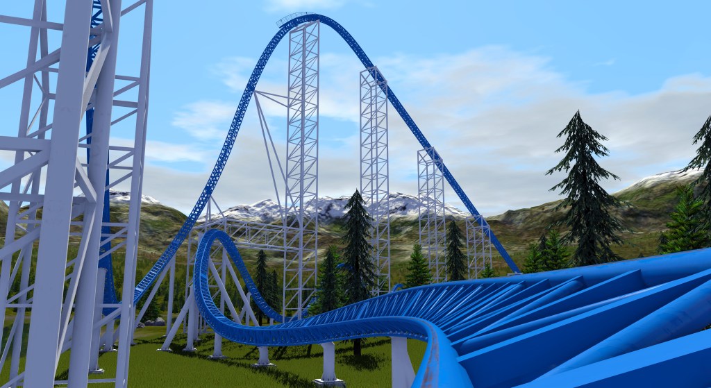 And lastly, below are some pictures and videos of the coaster in its entirety. Pardon the lack of scenery besides landscaping and sharp transitions between banking and g-force changes. As written, the script only utilizes a linear transition between changing g-forces and banking values, rather than a sinusoidal transition that would allow for a smoother gradient between values. However, the coaster still rides pretty smooth and overall turned out rather nicely for the style I wanted to recreate. Enjoy!