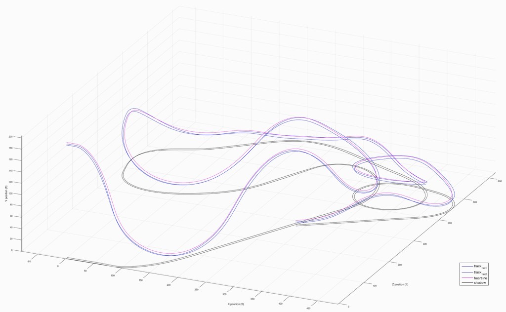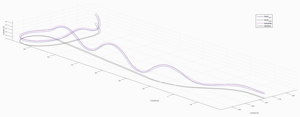 Part 1 of the track begins at the top of the lift hill and continues along until midway through the ride, where part 2 picks up. The track was split into two parts because my code could only accommodate a certain number of length segments, and also the inaccuracies in my estimation of friction, air resistance, etc. gets amplified the longer the track is within each instance of the script. Additionally, you will notice the main drop off of the lift hill was modified from the code when looking at the No Limits model. This was done for aesthetic reasons, to match the Intamin hypercoaster-style ride I ended up basing the trackwork off of. The MATLAB code for Part 1 and Part 2 of the track can be found at end of this article, titled “Track Centerline Code – Section #1” and “Track Centerline Code – Section #2”.