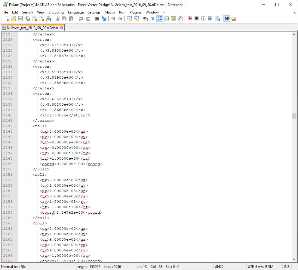 Once each section of the track layout was completed within MATLAB, the next step was to export the track path data into a format that could be imported into NoLimits 2. The key to doing that was to recognize that the NoLimits 2 track element file (“.NL2ELEM”) is really a .xlm file containing data that defines the track position at intervals along its path. Below is a screenshot of a .NL2ELEM file opened in Notepad++ in order to show how the file is configured: